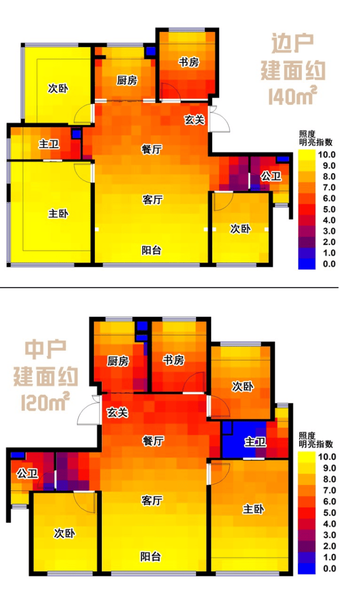 上图为两个户型的采光模拟计算,黄色橙色代表最明亮的地方,所有主要房间基本上都被覆盖。