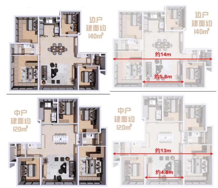 壹江臻邸首开的这两个户型产品在空间尺度的把控上,展现出超越同级的卓越产品力,重新定义了纯粹改善社区的空间尺度标准。建面约120㎡户型南向轴线面宽达约13m,140㎡户型更是达到了约14m,这一数据显著超越了同面积段产品普遍12-13米的常规水平。