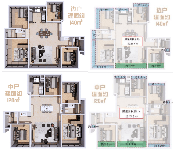 §建面约140㎡的产品,更是通过6个飘窗(含2个转角飘窗)、2个南向阳台(赠送一半面积),赠送约20.4㎡,加上私享约6.8㎡的电梯厅,整体赠送面积高达约27.2㎡。