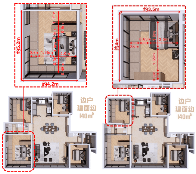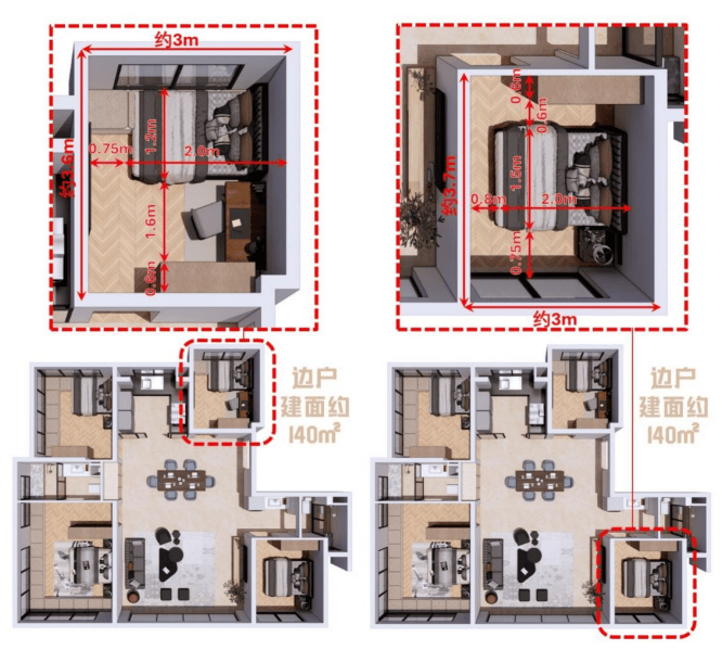 南向主卧轴线面宽约3.6m,南向次卧轴线面宽约3m,并且享有与140户型相近的进深尺度;北侧两个次卧轴线面宽分别约2.6m与2.8m,结合附赠的飘窗,亦可完美容纳“单人床+书桌+衣柜”的配置。