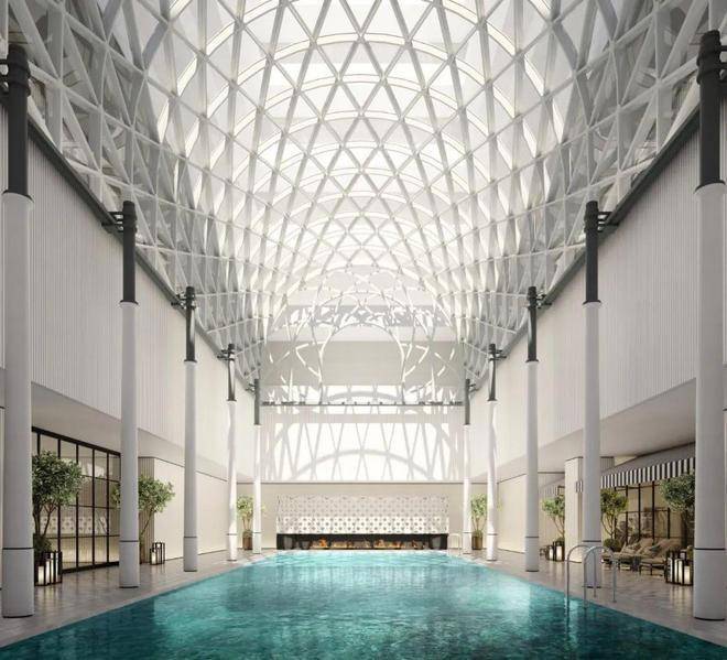 酒店的体量更大,足足3.7万方的城市度假型酒店空间里,装载了健身房、双泳池、餐厅、酒廊等一众高端业态,而且每一项都精准击中了“爽点”。