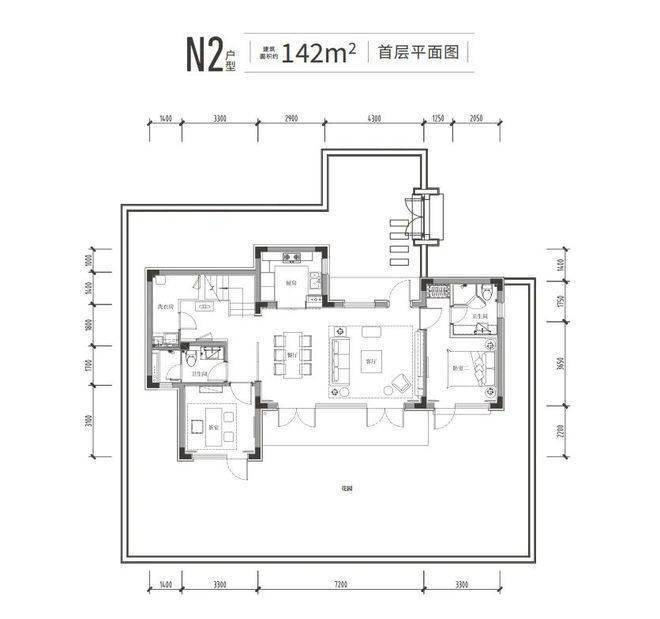 以约142㎡户型为例,可设计为4房4卫,一楼奢适的餐客一体大方厅,可作为一家人的度假生活中心,二楼还拥有两个套房,带孩子和父母周末小住、更带有约110㎡花园,足够你种上一圈花草修竹,摆一个茶几两把躺椅,夏天果树成荫,冬天红梅傲立,生活的烟火气立马就出来了。