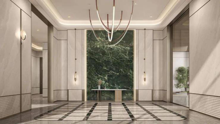 首层超高入户大堂,普拉达绿奢石背景墙