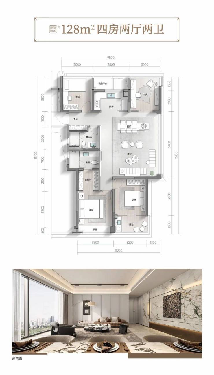 空间效能进化 超90%得房率在空间效能维度,君潮润府通过面宽的增加,将主客厅面宽拓展至7.8米,配合封闭式景观阳台设计,使225㎡户型在得房率超90%的前提下实现五房五卫三套房的格局。