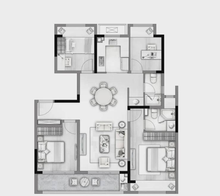 当第一缕晨光穿过南向阔景阳台,洒向首层的餐客厅与卧眠区,三代人的一天在此徐徐展开。