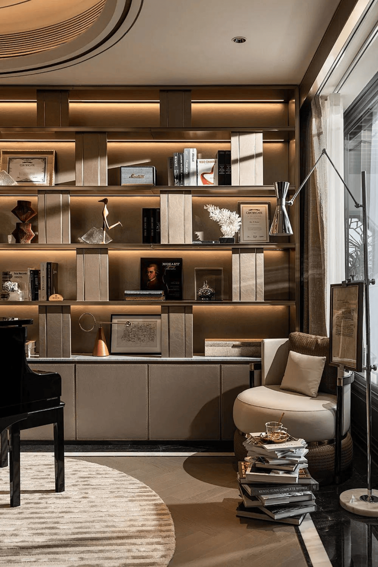 午后,阳光愈发温暖,一楼的客厅里,奶奶翻阅旧相册,爷爷听着京剧轻哼。负一楼的书房中,爸爸敲击键盘处理一些工作上的文件,间隙望向庭院绿意放松心神。吧台旁,妈妈抿一口咖啡,享受独处静谧。负二楼的客厅一角,女儿安静地玩耍,爸爸忙完去健身房里,跟着动感的音乐,挥洒着汗水。