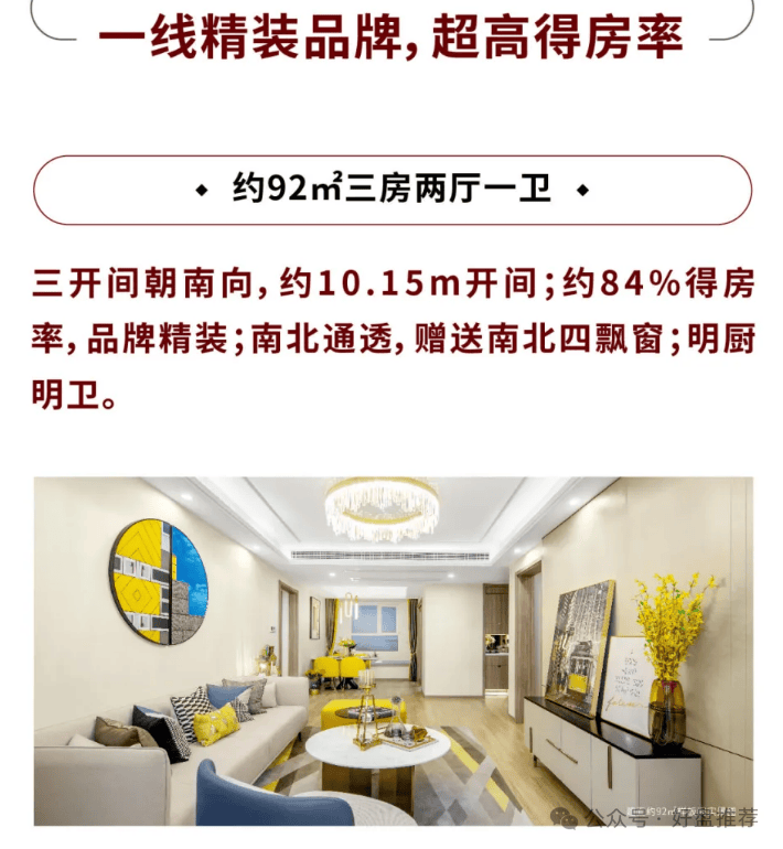 92㎡三室两厅一卫:总价120万起,得房率85%,三开间朝南,南北四飘窗设计38。