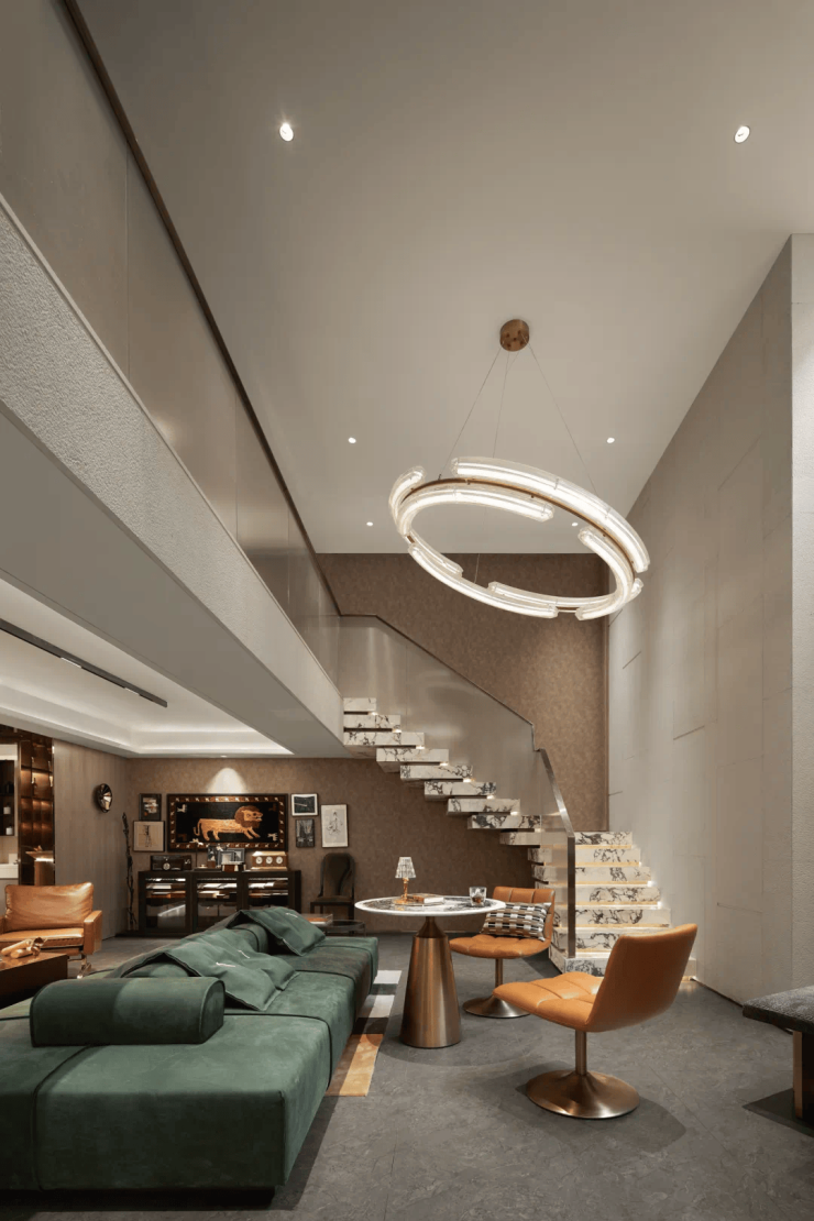 约5.1米挑高的灵动空间垂直延展出“家庭第二生活场”,负一层,吧台佐酒,书房品茗;负二层影音室逸情,健身房塑形,洽客会友。以“买一得三”的极致利用率,成就一家五口的叠墅享受。
