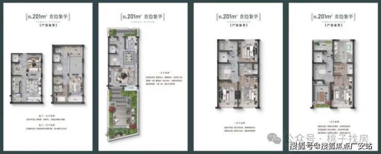 合院采用地上三层+地下两层布局,边套带三面花园(100-150㎡),主卧套房配备星空双露台35