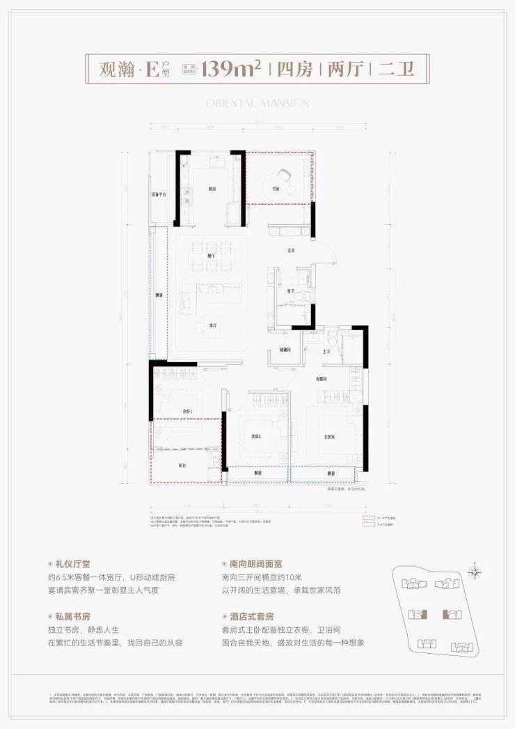 建面约139㎡的边套大四房,做到了四开间朝南,近10米开间的超大阳台而且只计一半的面积,餐客厅的面积奢侈地将近40㎡,几乎就是豪宅的舒适尺度。