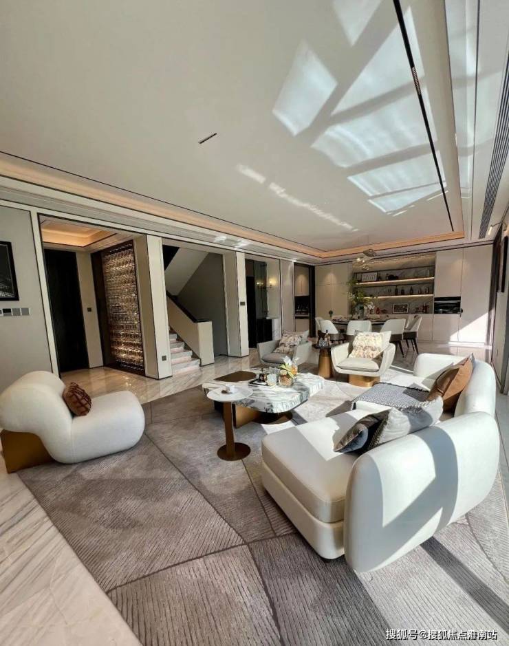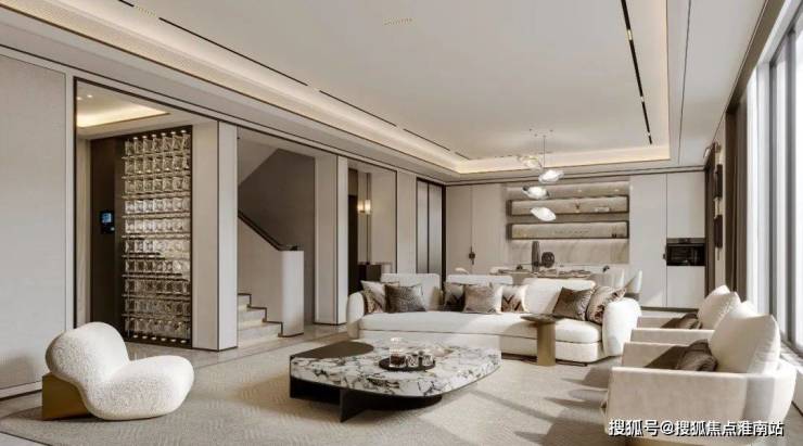 一层是会客区,约10.7米的超大面宽,阳光、空气可以“肆意”穿过,室内通透明亮。