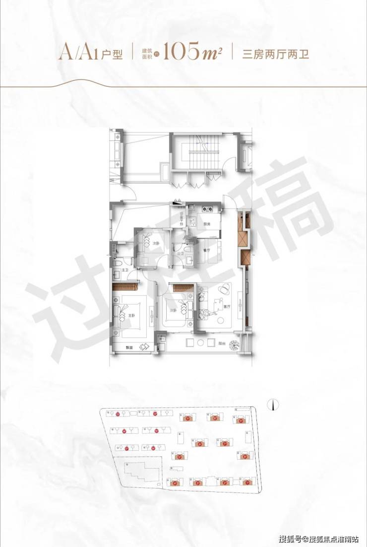 建面约105方三房两厅两卫户型: