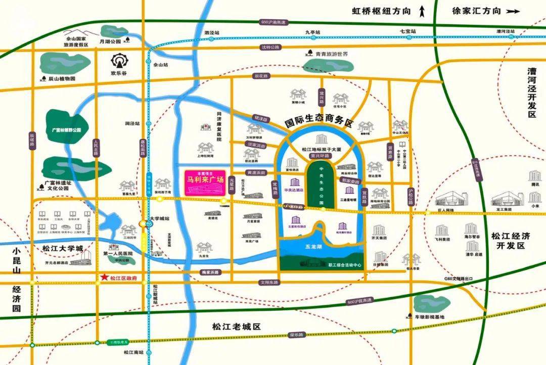 项目位于上海市少有国际生态商务区核心位置,距地铁9号线松江大学城站步行10分钟,9号线可直达徐家汇、上海世博园、陆家嘴金融区多个商业中心,并与轨道交通1、2、3、4、6、11号线接驳。周边有G50、G60、沪杭高速、嘉金高速构成立体化的交通网络,使得您的出行极为便利。