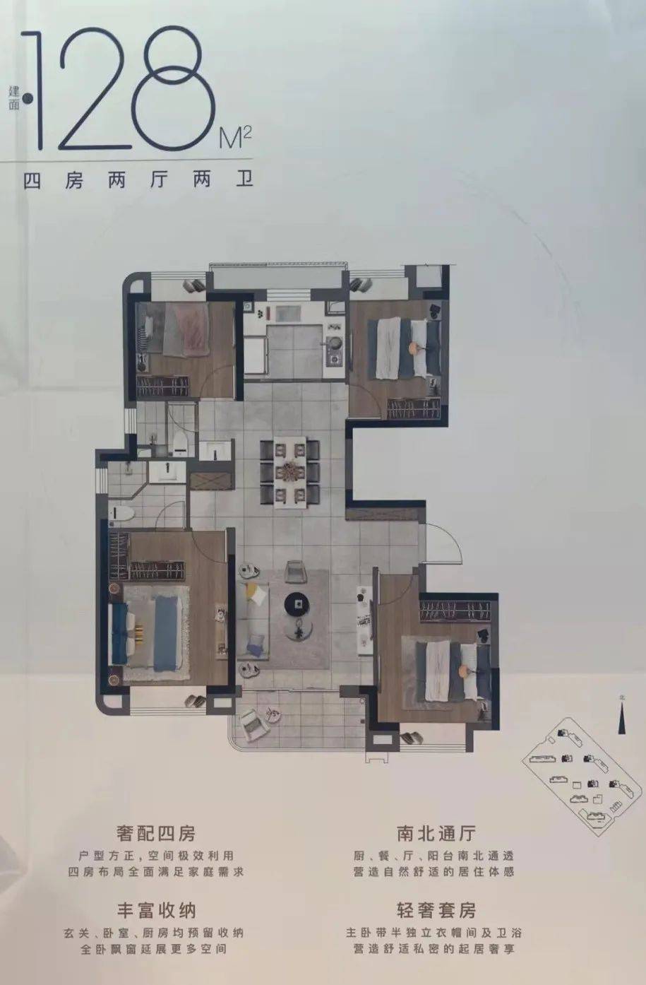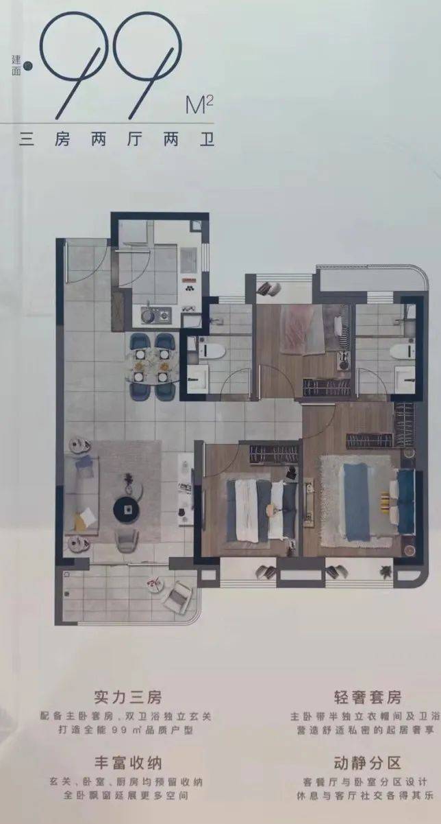 据悉,项目首期开发两个地块,将提供约1032套可售住宅。首批房源包含两个主力户型:建面约99㎡三房两厅两卫,建面约128㎡四房两厅两卫。