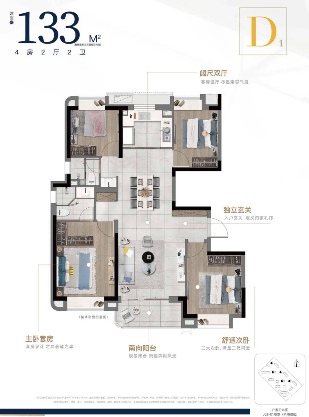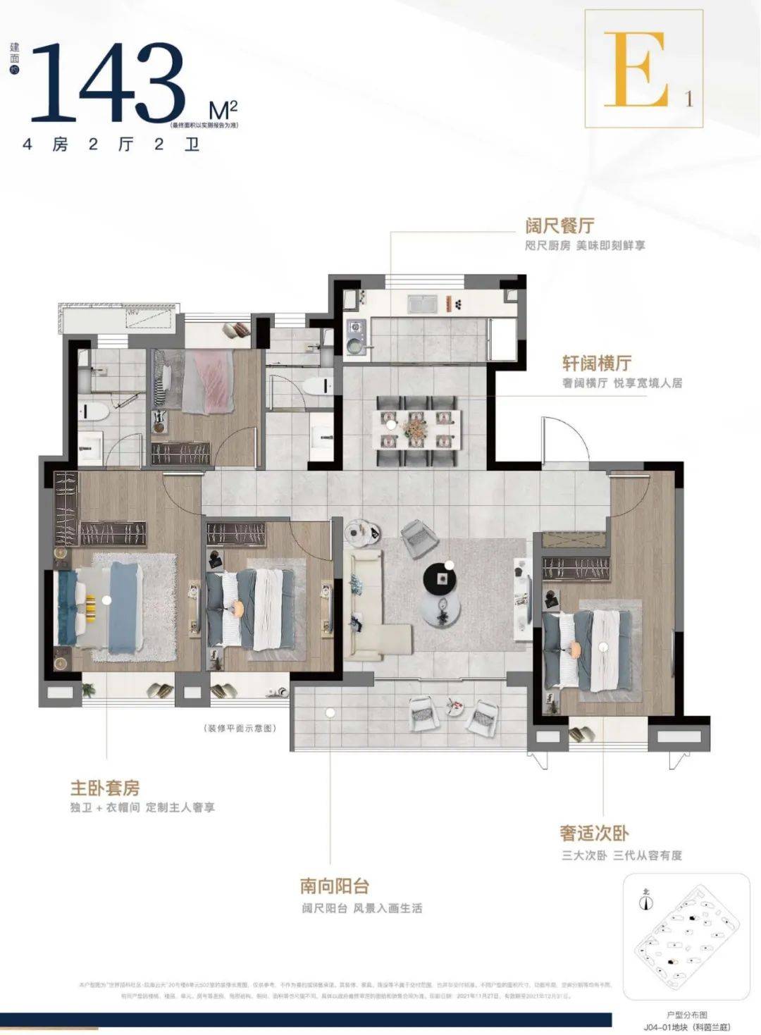 建筑面积约143㎡4房2厅2卫首次面世,大面宽短进深,4开间朝南,采光优越。3房朝南,主卧套房设计,独立卫生间、衣帽间,成就一方自在天地。大尺度阳台,尽享诗意生活。