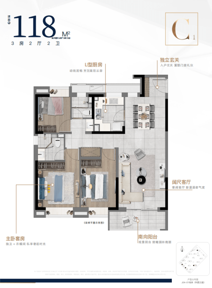 建筑面积约118㎡3房2厅2卫,经典大三房,主卧套房,将空间利用较大化,三代人各居一室,私享静谧时光。餐客厅阳台一体,扩展家庭活动空间,休憩娱乐进退有度。