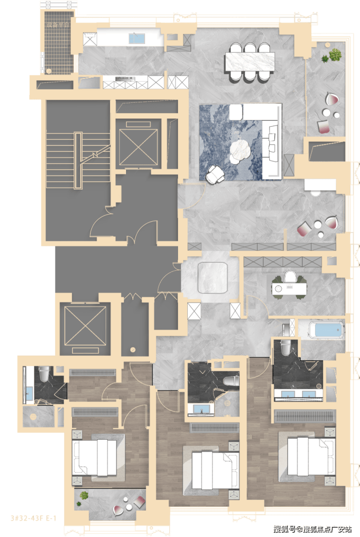 In simple terms, the tower is centered around the elevator and staircase, and after reaching the floor, one can directly enter the apartment by walking in any direction.