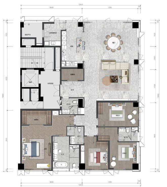 横向L型走廊,开阔洄游动线模糊界限,放大空间的优势拓宽视觉感受,同时,LDK一体化全家庭社交厅,动静分区、南北通透、岛台设置……空间以相互交错的平面圆弧为层次结构,在互动间让心灵情感升温,带来全维感官享受上的跃升。