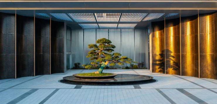 震撼、奢华的开阔门头,点缀形似“迎客”的苍劲古柏,不吝成本的巨大投入,从这里归家,自然是步步高升