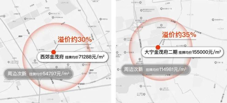 大宁金茂府二期挂牌约15.5万/㎡,周边次新整体挂牌约11.5万/㎡,金茂府有约35%溢价;