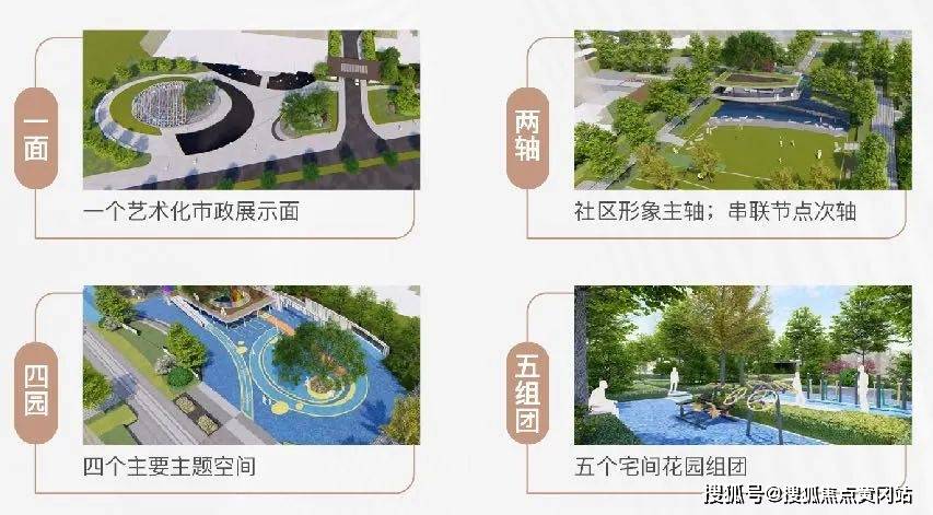 社区内部整体采用“一面,两轴,四园,五组团”的园林景观格局,小区内部涵盖全年龄段的娱乐设施,也设置了遮阴廊架,保证老人儿童在光照充足的场地休闲活动。入口花园、中心水景花园、综合活动乐园、社区公园这四大园林,设计了社区会客厅、阳光草坪、健身空间、儿童乐园、萌宠乐园等休闲空间,营造“公园中的家,家中的公园”生活氛围。