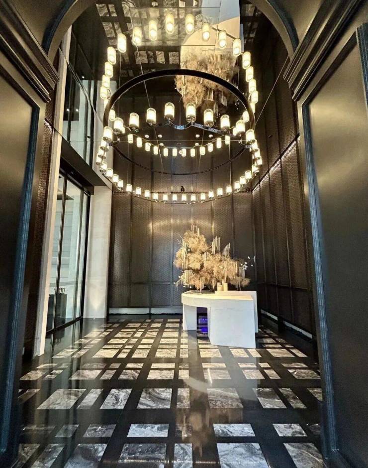 材料选用意大利石材,BVLGARI HOTEL大理石,铝型材塑型红,四层金属网格墙面以及梧桐叶金属屏风等,打造独属老静安的记忆符号,高奢定制,市区豪宅调性拿捏!