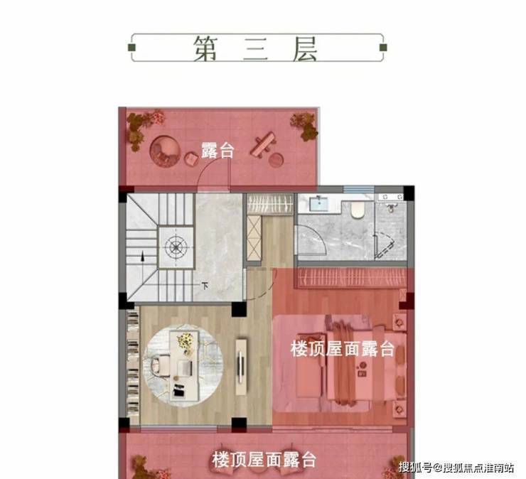 三层,整层套房设计。该层赠送约 23㎡的南北双向大露台,这里作为建筑的“空中延伸空间”,兼具视野开阔、采光充足的优势,无论是打造成亲近自然的露台卧室,还是多功能的生活场域,都能极大提升居住体验。