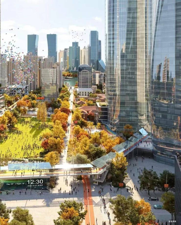 对标纽约高线公园的线性连接理念,以及伦敦金融城的空中步道网络,这里规划了约4.5公里空中连廊系统串联楼宇与公共空间,示范段已连通友邦金融中心、北外滩来福士,实现工作生活无缝切换;