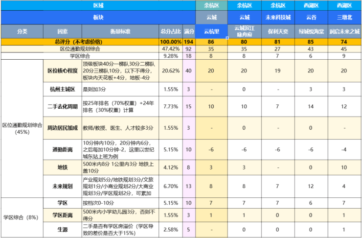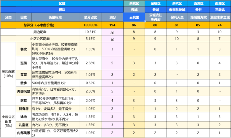 本次评分选取【云城咏舟府】、【未科保利天奕】、【云谷悦海棠(售罄)】、【三墩北润启未来之城】与【云杭里】做5盘横向对比,对比结果可见每小节总结图