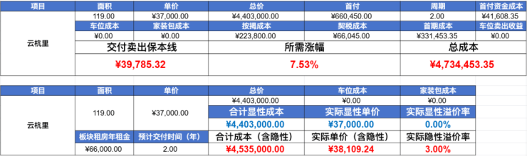 b. 只算租房成本的价格为3.81万/平=交付时以3.69万/平购入(不含大税)