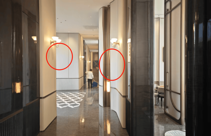 就我现场看到的,项目的过道墙面、私宴厅/棋牌室的墙面、楼梯扶手、电梯墙面,都用的人造皮革包边