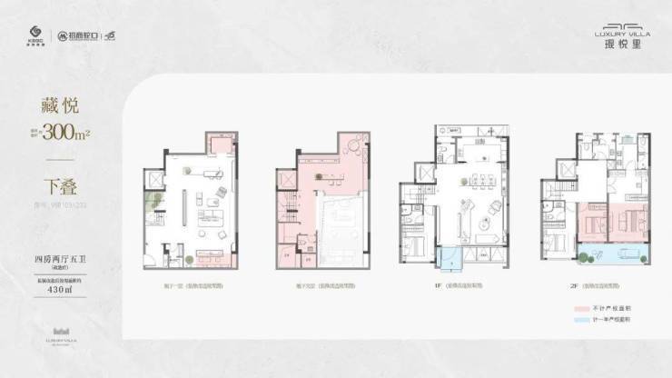 • 建筑面积约300㎡下叠,实得面积约430㎡,四房两厅五卫