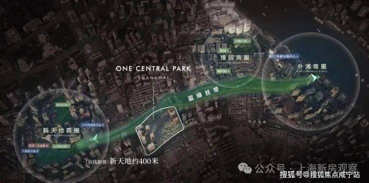 咫尺新天地 蓝绿丝带上的关键节点距离新天地直线距离约400米 ,作为蓝绿丝带规划上的关键节点,随着大新天地东进南拓战略逐步实施,通过水景、绿地和公共空间,串联新天地、豫园、外滩三大世界级商业版图。