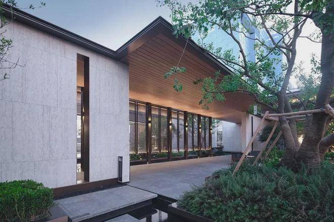 建筑门堂的比例恰到好处,呈现出诗意画境。1:5至1:6的高宽比,使建筑既稳重又灵动。入口两侧的景墙与水景相映成趣,勾勒出一条充满诗意的归家之路,体现了江南昆山的东方韵味。