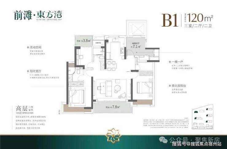 建面103㎡3房2厅2卫,户型三开间朝南、室内“5个飘窗+2阳台”,不管是采光、视野、通风、私密性,还是实用性都十分出色.