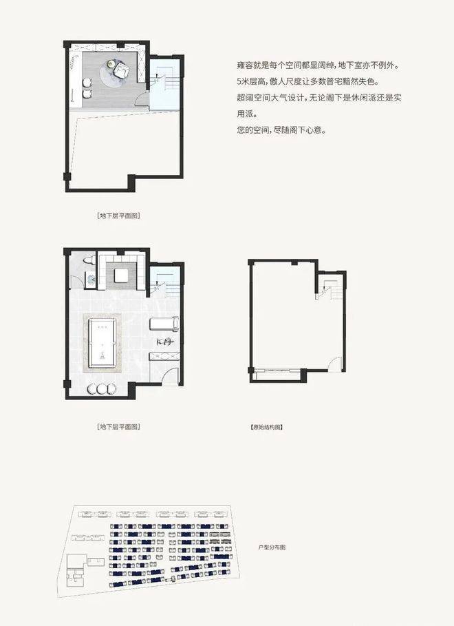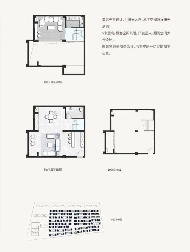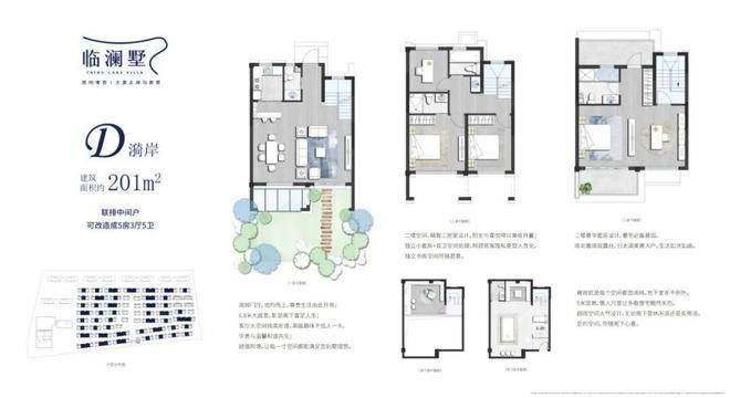 别墅产品:251套,201㎡、218㎡的联及 218㎡的双拼别墅,地下一层、地上三层。地下室层高 5米。花园20-80平不等