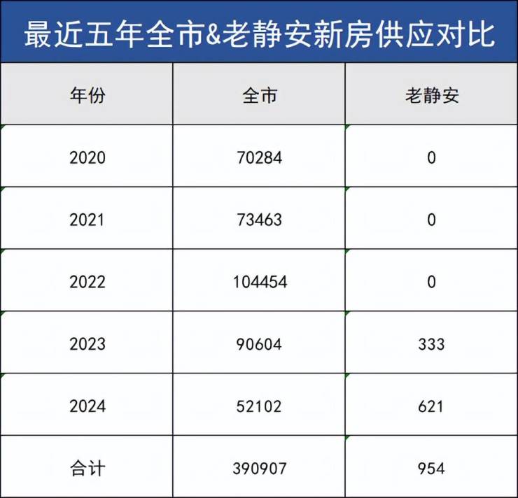 过去五年,全上海一共供应约39万套新房,位于老静安的仅954套,占总供应量的约0.24%,几近于无!