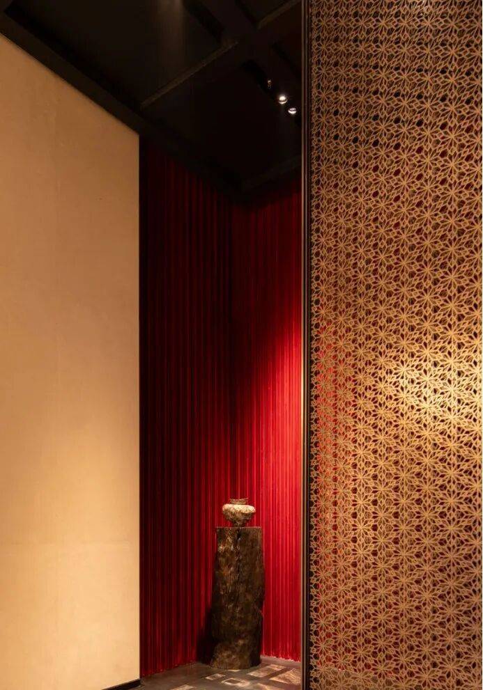 材料选用意大利石材,BVLGARI HOTEL大理石,铝型材塑型红,四层金属网格墙面以及梧桐叶金属屏风等,打造独属老静安的记忆符号,高奢定制,市区豪宅调性拿捏!