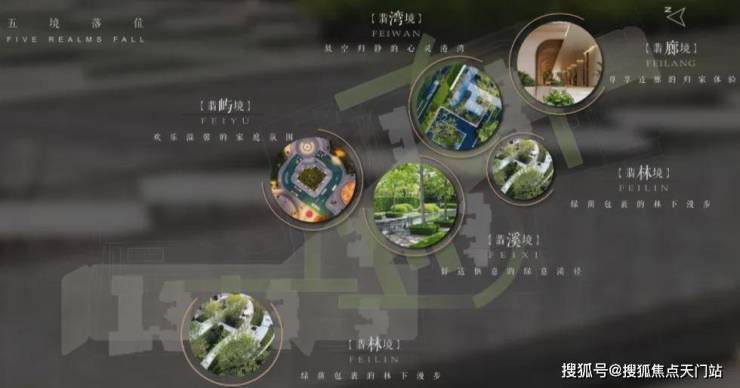 规划了“翡色五境”五大空间氛围,匠造融入时光、人文海派、自然与艺术、家庭与邻里的“四轴、三园、五区、一所”四大功能空间.