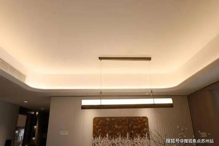 「招商中旅·揽阅」售楼处电话:400-965-9259【预约热线】☎● 客餐厅:客餐厅地面同样采用了750*1500的大砖,电视背景墙采用浅色大面岩板。顶部采用弧形石膏板吊顶+四边反光灯槽(圆弧角)+吸顶灯+磁吸轨道灯,使客厅空间在视觉上显得更加宽敞。