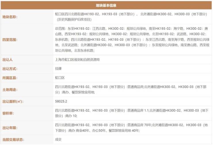 2021年2月,上海虹口城市更新建设发展有限公司(上海地产联合体)以111.35亿拿下了虹口区四川北路街道HK193-02(17街坊弘安里)、HK193-03(地下部分);北外滩街道HK300-02、HK300-03(地下部分)(历史风貌保护旧改项目)。