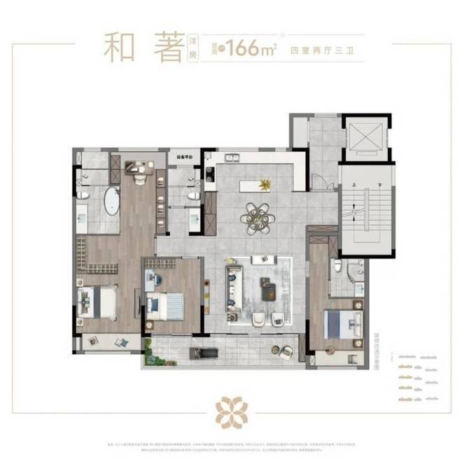 户型面积:约131-195㎡四居室,含南向大阳台(最大约10米)、LDKB一体化设计2