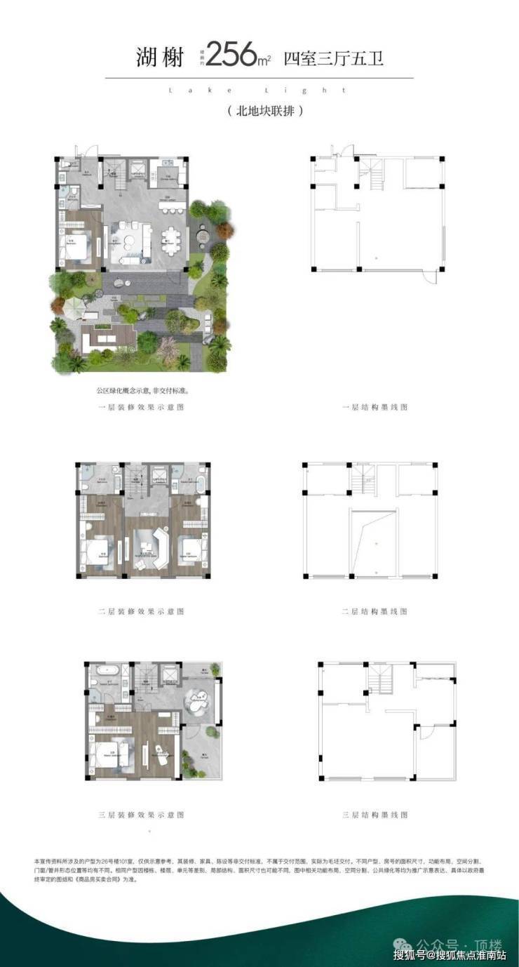 (1)联排:打造约246m²、约256m²(边户)、约280m²三个户型面积,以迭代的联排作品,致敬真别墅的回归