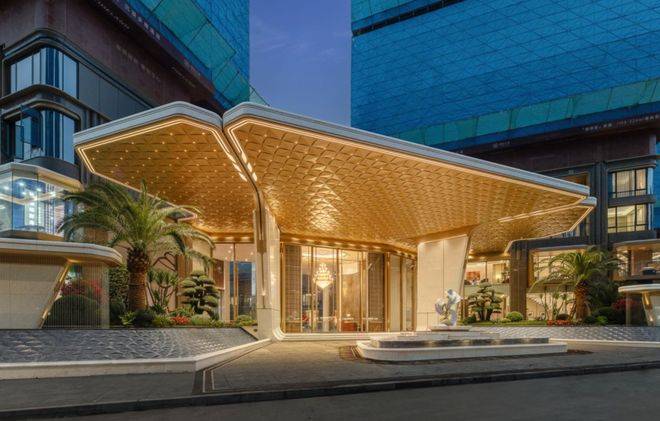 首先,是扑面而来的视觉革新。如果你看惯了传统豪宅沉稳的卡拉麦利金石材,那么潮语江澜府的主入口与立面,会带来全新的审美冲击。它从经典的“老钱风”,优雅地转向了更具现代张力与艺术感的“轻奢派”。外立面以咖色铝板为基底,镶嵌以精致的蓝色铝板线条,搭配大面积的通透玻璃与局部石材,在光影流转间,呈现出一种时髦而高级的质感,瞬间与周边产品拉开代际。