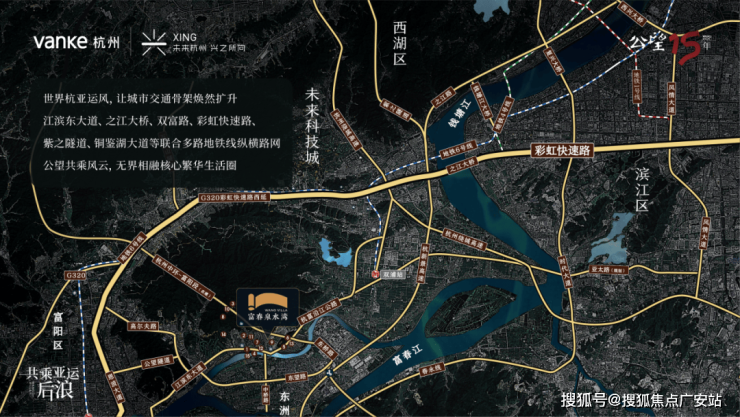 Through convenient transportation networks such as Jiangbin East Avenue and Caihong Expressway, it is seamlessly connected to the city center. It only takes about 20 kilometers by car to reach Binjiang District, easily integrating into the half-hour economic and living circle of Hangzhou.