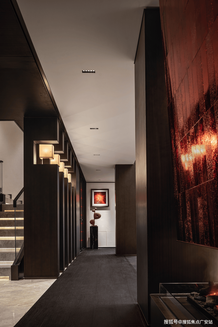 The floor plan of the first floor is in a "curved ruler" shape. The living room and dining room are connected by a corridor. The living room and dining room are in a 45-degree Angle facing each other, separated by an inner courtyard water feature, which ingeniously solves the infiltration relationship between the interior and exterior.