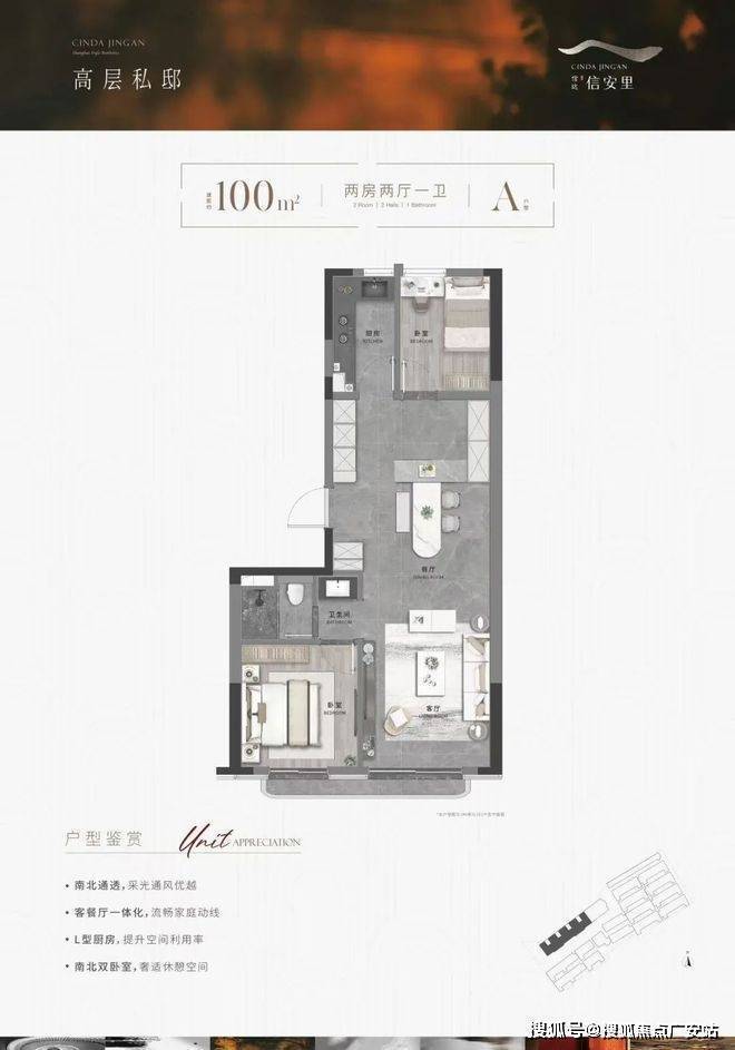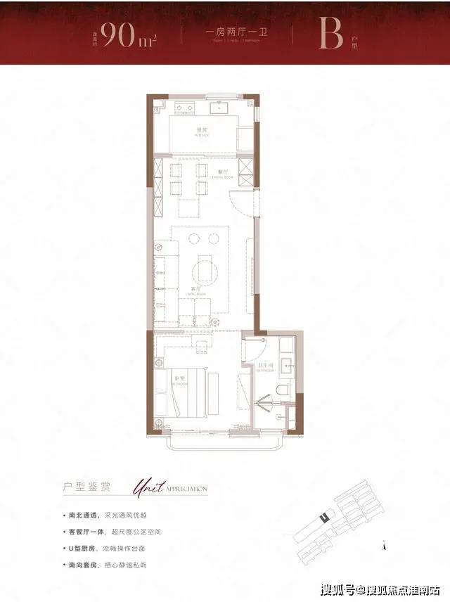 上海静安信达信安里售楼处电话:400-9939-964从户型图来看,建面90㎡只做了一个卧室,南北通透纵深很长,餐客厅一体占到一半以上面积,南向卧室全景阳台带卫浴套间,除去北侧与卧室差不多大的厨房,整个户型设计与酒店相似。