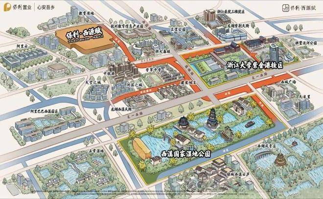【保利置业·西源赋】是西湖、西溪以北绕城内与蒋村地王并存的唯二新盘。正处城西大走廊的起始点紫金港板块,东南约1.5km即为浙大紫金港校区,直线距离建设中的地铁4号线莲池站仅约660m。