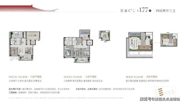 比如建面约170㎡的双层下叠四房两厅三卫,约9.7米面宽,三开间朝南的大四房格局。约6.9米面宽,两房朝南;南向房间一字拉平,北向也设置房间,但确保每一层空间,与院落、阳台或露台衔接,迎接漫天漫地的阳光与月光。