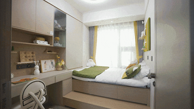 除了垂直的衣柜收纳,项目儿童房还把床整体抬高,下面做了2层抽屉,上层高度较高,可放置儿童玩具,下层较扁,可放置小朋友的内衣袜子或书本。